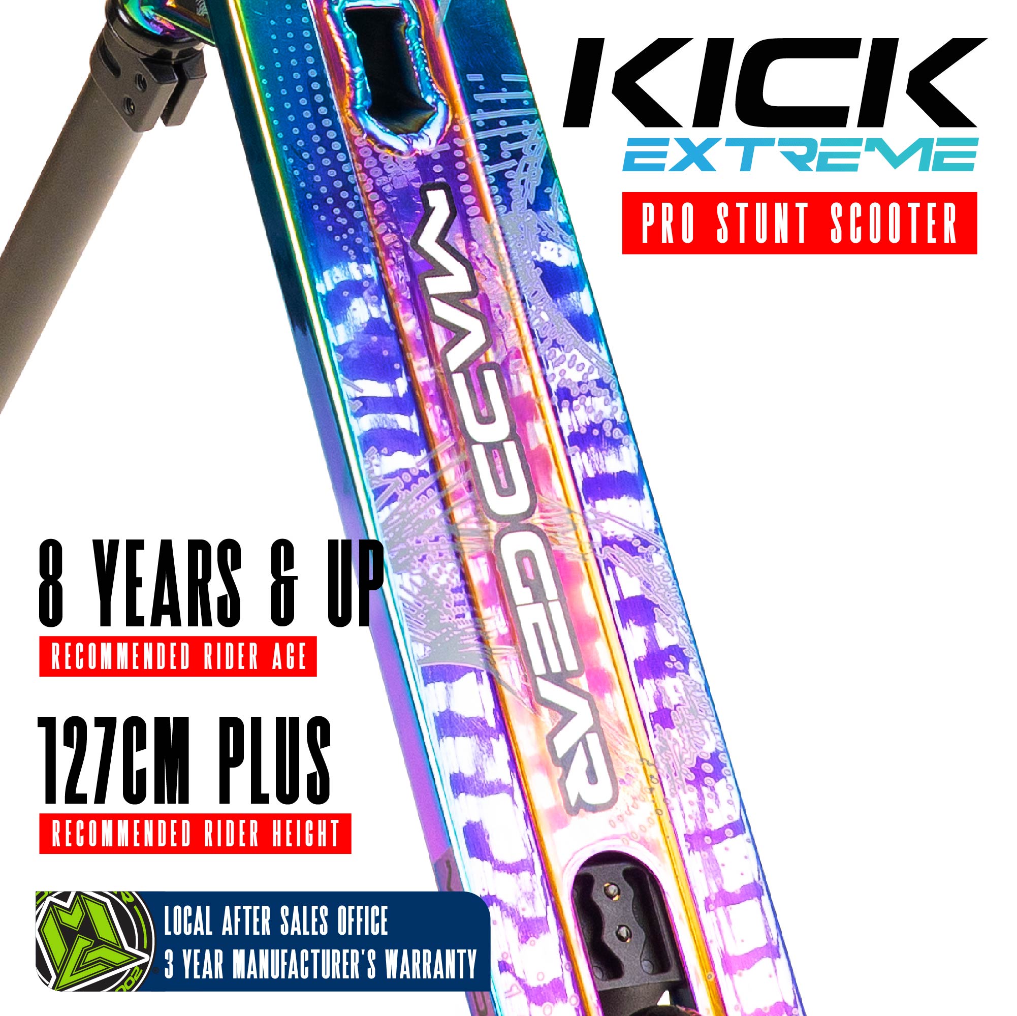 Whether you're learning your first tricks or refining your skills, this scooter is built tough to handle everyday stunt riding. With its high-quality extruded aluminium deck and a strong one-piece steel handlebar, the Kick Extreme Pro Scooter is lightweight yet durable, supporting riders up to 220 lbs.